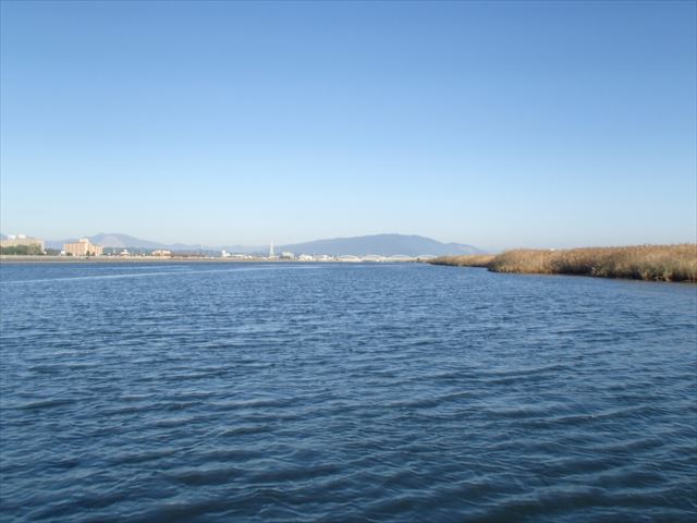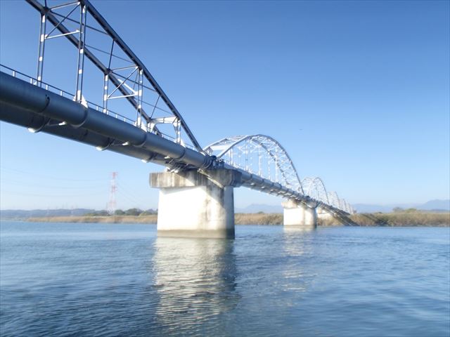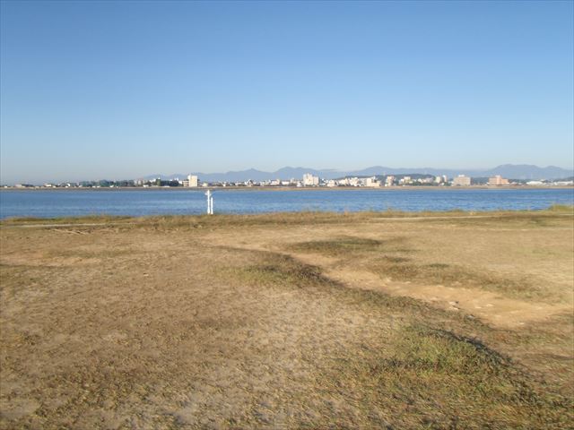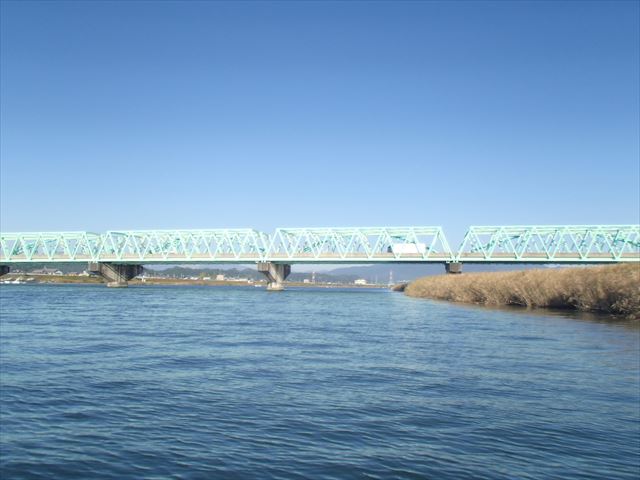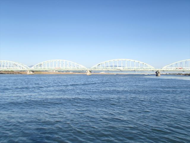 | 出発時間は7時5分 | 振り返って、長良川から揖斐川に入ったところ遠くに国道23号が見えます。 |
