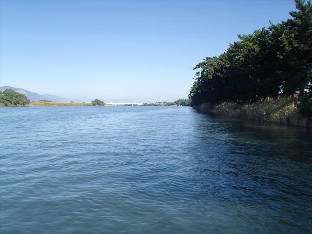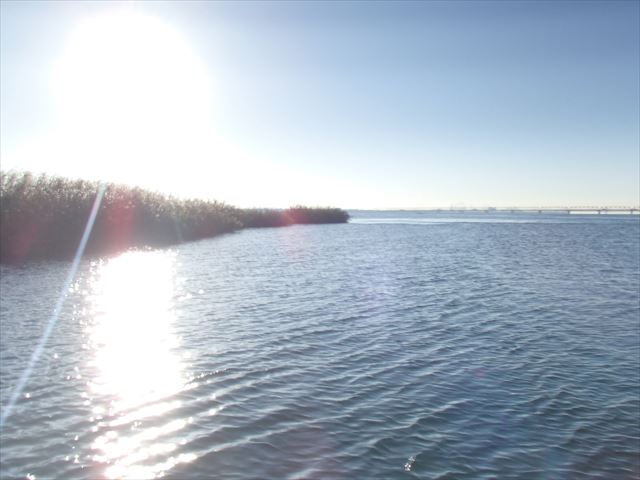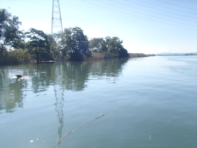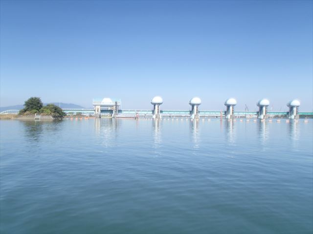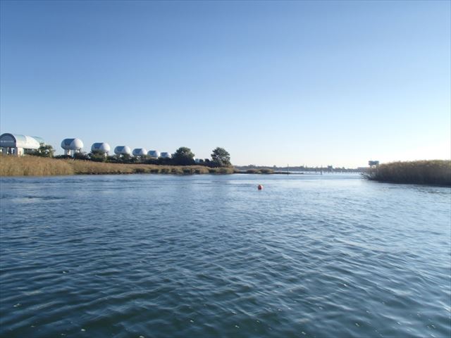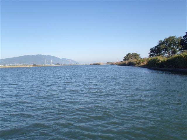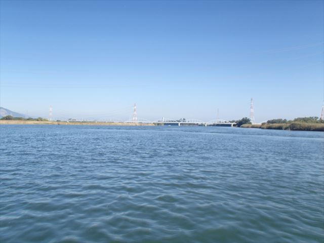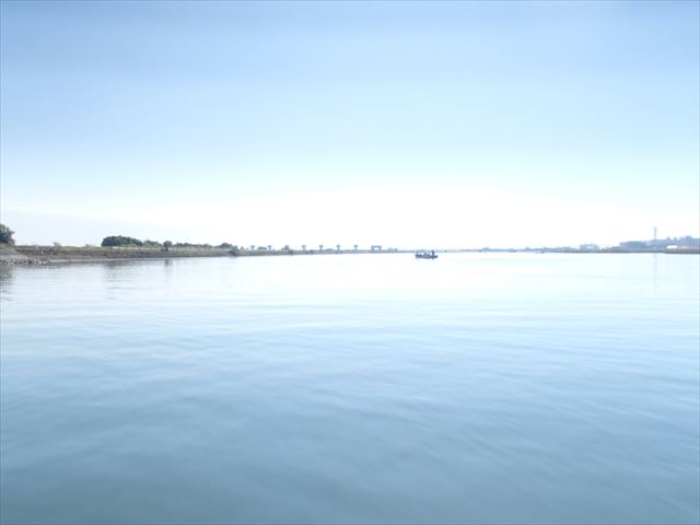 | 川上を向くと遠くに国道1号線が見えます。 | 河口堰近くに長良川と揖斐川の接続部があるのは知らなかった〜〜(笑) |