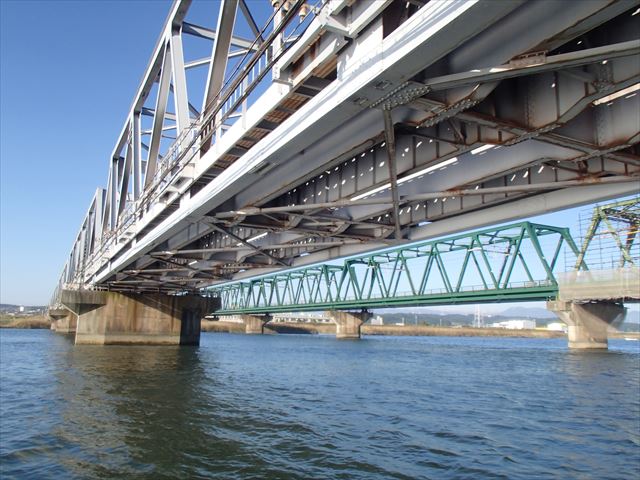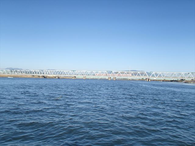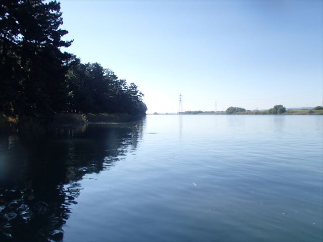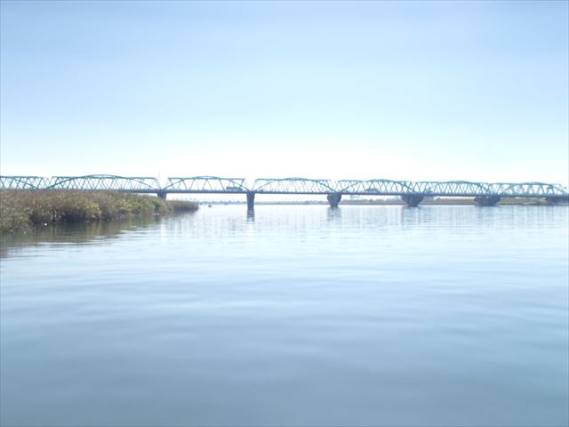 | 近鉄とJRのガードをくぐった所、愛しの河口堰(笑)が見えてきました!! | 帰りは行きに見つけた河口堰近くの長良川と揖斐川の接続部から長良川に入ります。 |