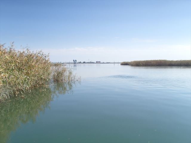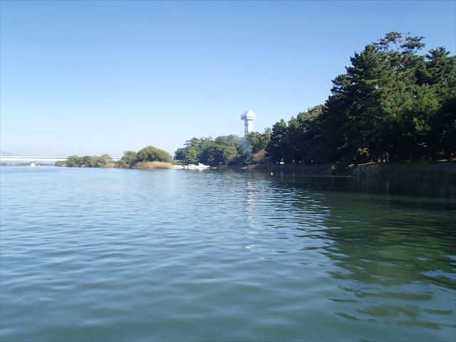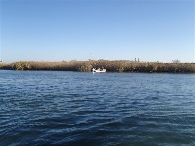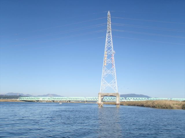 | 漁師の方、しじみを取っております。 | 高圧電線の鉄塔が見えてきました。なんか怖いけど下をくぐってみます(笑) |